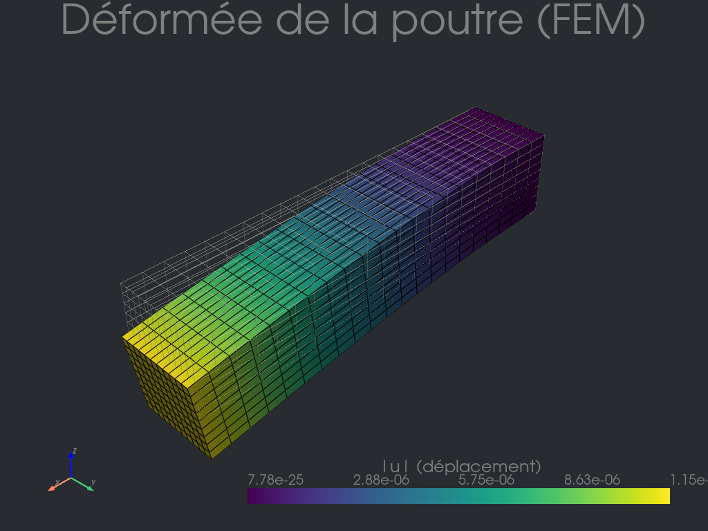 Le cas étudié est celui d’une poutre en flexion résolue par éléments finis (FEniCSx).